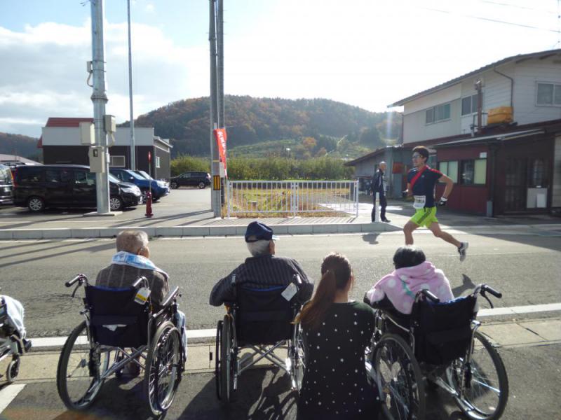 第64回西村山地区駅伝競走大会が開催されました。朝日町の創遊館前がスタート(9:00)です。前日の夜から朝方まで雨でしたが、スタート時間には日が差して気持ちの良い天気になりましたので、施設前の沿道で応援ができました。応援席の目の前を走るので、入居者の皆さんは選手が通るたびに「がんばれー」と声を出して応援しました。