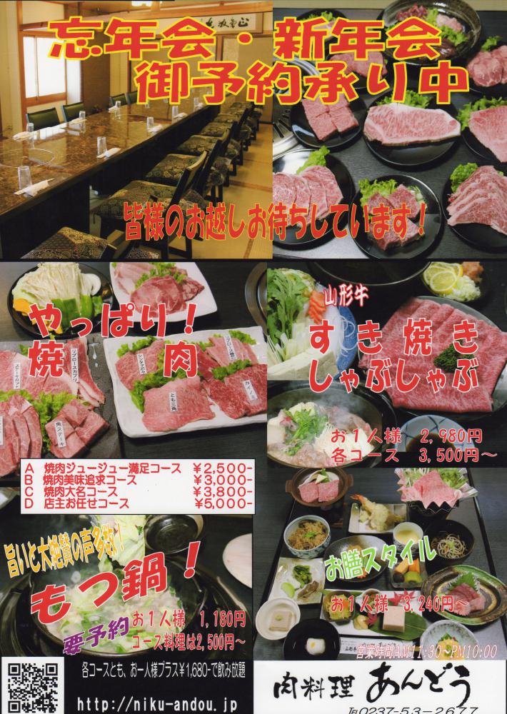 肉料理あんどうではでは、只今、忘年会・新年会のご予約承り中 です!企画満載で皆さんの、お越しお持ちしています幹事さん是非ご利用下さいm(__)m