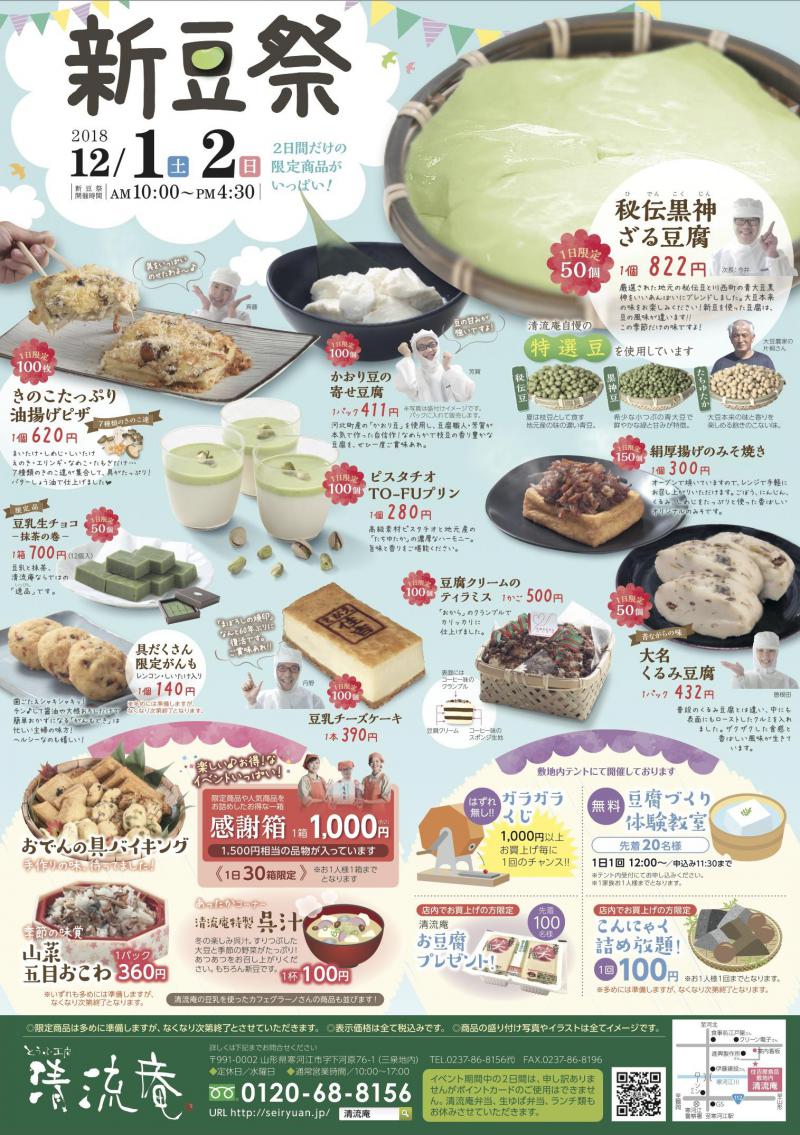 今年もいよいよ 新豆の季節 がやってきました!地元の農家さんが丹精込めて造ってくださった新豆で豆腐づくりができることに心から感謝しております。おいしい限定商品 をたくさんご用意して、皆様のお越しをお待ちしております。今年もぜひ出来立ての新豆を味わいにいらしてください。自然の恵みに感謝して______。清流庵 店主▼日時 2018年12月1日(土)10:00〜16:30 2018年12月2日(日)10:00〜16:30 ※2日間開催いたします!▼内容 1) 清流庵の感謝箱(1日30箱限定のお得な一箱) 2) ガラガラくじ(1,000円以上お買い上げ毎に1回のチャンス!) 3) お豆腐プレゼント!(店内でお買い上げの方・先着100名様) 4) こんにゃく詰め放題(店内でお買い上げの方・お一人様1回100円) 5) 豆腐づくり体験教室12:00〜(先着20名様・お申込は当日11:30迄) 6) 清流庵特製・呉汁(1杯100円です!) 7) 新豆祭限定のオリジナル豆腐スイーツなど♪ ※詳しくは以下のチラシをご覧下さい。 → チラシの拡大画像を表示