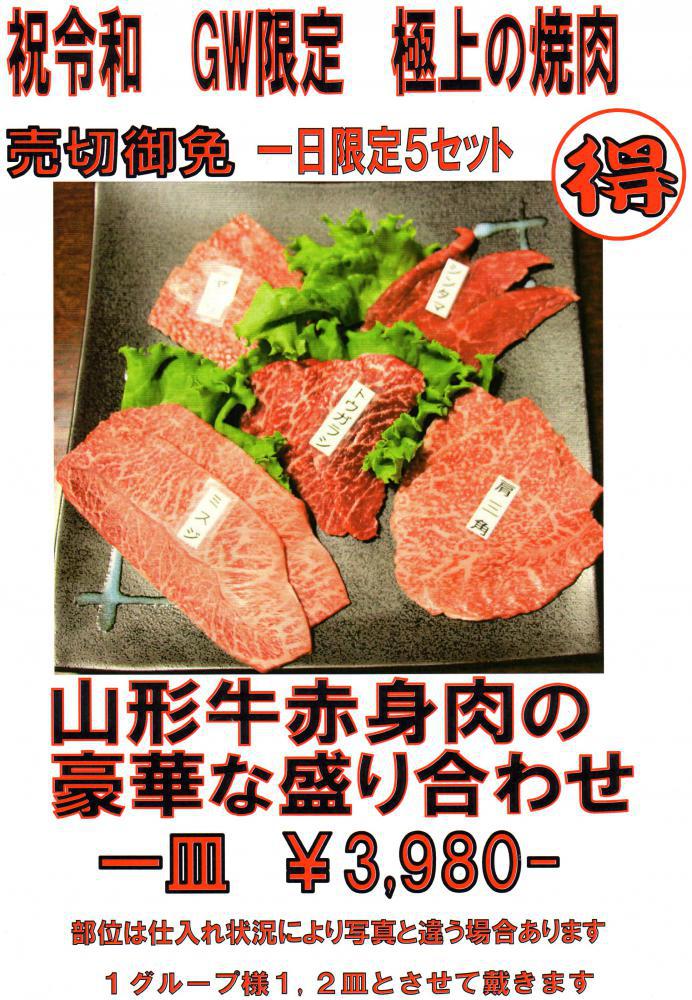 祝令和! GW限定 一日限定5セット山形牛の赤身肉の盛り合わせです。是非この機会に赤身肉の部位の食べ比べは如何ですか