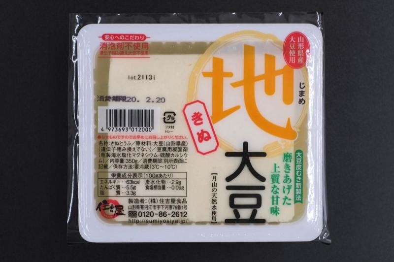 地大豆(じまめ)は、私たちのふるさと山形にとことんこだわって作ったお豆腐です。山形県産大豆を100%使用したこだわりのきぬ豆腐です。他の国産大豆でつくった豆腐と比べても、味わいの深さとコクがひと味違います。1)山形の豆にこだわる ふるさと山形の農家さんが心をこめて生産した大豆にこだわり、 地域限定の山形県産大豆(タチユタカ)を100%使用しました。2)山形の水にこだわる 山形の霊峰月山の雪解け水は、ブナの原生林を下り、 寒河江川の地下層を伝わって、純度が高く、 ほのかな甘味を感じる天然水として工場に組み上げられます。3)山形の業にこだわる 製造量も限定されますが、 地元に伝わる昔ながらの自然製法で じっくり手をかけて造り上げた良質な木綿豆腐です。〈商品名〉 地大豆(じまめ)きぬ〈名称〉 きぬとうふ〈原材料〉 大豆(山形県産・遺伝子組み換えでない) 豆腐用凝固剤(粗製海水塩化マグネシウム・硫酸カルシウム)〈内容量〉 350g〈保存方法〉 要冷蔵(3℃〜10℃)→ 「地大豆(じまめ)きぬ」ツインパック