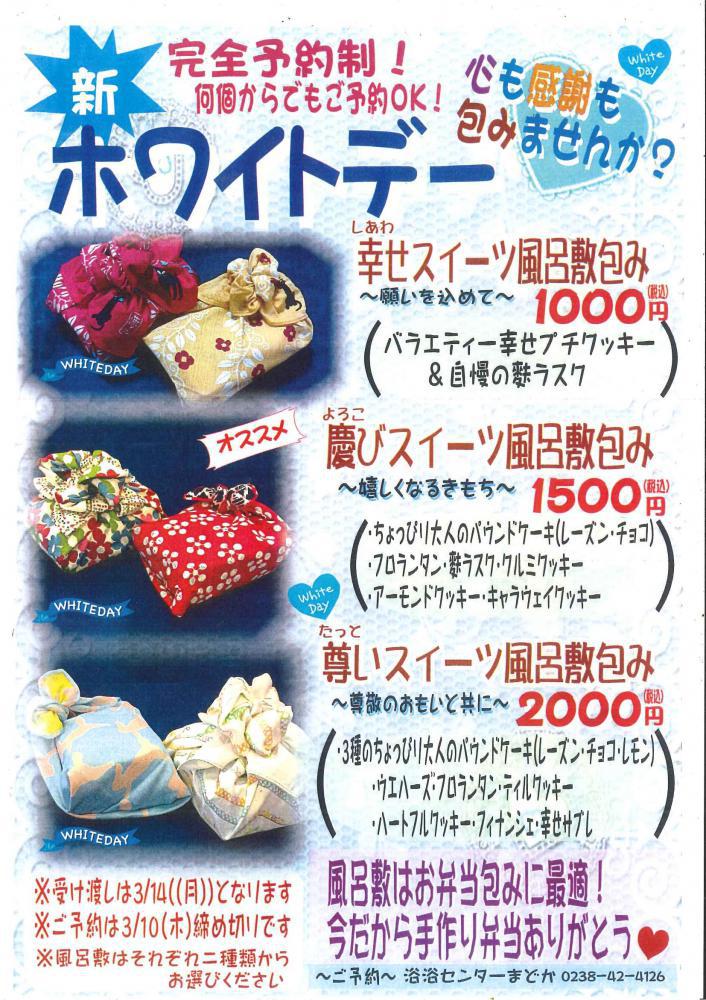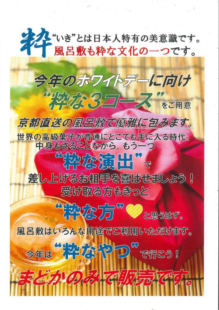★新ホワイトデー★ バレンタインのお返しや、自分へのご褒美に まどかのスイーツを風呂敷包みで送りませんか? 3種類のコースをご準備しました♪★幸せスイーツ風呂敷包み〜願いを込めて〜・・・1,000円税込   内容:バラエティー幸せプチクッキー&自慢の麩ラスク★慶びスイーツ風呂敷包み〜嬉しくなるきもち〜・・・1,500円税込  内容:ちょっぴり大人のパウンドケーキ(レーズン・チョコ)     フロランタン・麩ラスク・クルミクッキー     アーモンドクッキー・キャラウエイクッキー★尊いスイーツ風呂敷込み〜尊敬のおもいと供に〜2,000円税込内容:3種のちょっぴり大人のパウンドケーキ(レーズン・チョコ・レモン)   ウエハーズ・フロランタン・ティルクッキー   ハートフルクッキー・フナンシェ・幸せサブレ※受け渡しは3/14(月)となります。※ご予約は3/10(木)締め切りです。※風呂敷は2種類からお選び下さい。風呂敷は、お弁当包みに利用出来ます。