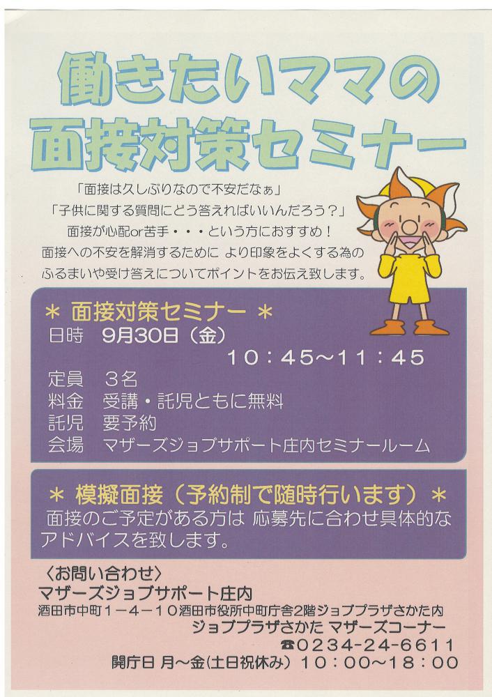 9月マザーズジョブサポート庄内  求職支援セミナー『働きたいママの  面接対策セミナー』 を行います!  このセミナーは 「面接は久しぶりなので不安だなぁ」 「子どもに関する質問に  どう答えればいいんだろう?」 面接が心配or苦手…  という方におすすめ! 面接への不安を解消するために より印象をよくする為のふるまいや 受け答えについてポイントをお伝え します。   ハローワークマザーズコーナーでは 定期的にセミナーを開催します。 奮ってご参加下さい。 受講後も疑問点など、 窓口にてご相談が受けられます。☆雇用保険受給者の方は 求職活動実績にカウント出来ます☆ 【日 時】 9月30日(金) 10時45分〜11時45分【対 象】 お仕事探し中の子育てママさん【会 場】 マザーズジョブサポート庄内  セミナールーム【料 金】 受講料 及び 託児料 無料【定 員】先着3名 ※お申込みが必要です。【託 児】定員3名 ※事前登録・予約が必要です。 ※併設の保育ルームで、保育スタッフが お子さんをお預かりします。 ママは安心して受講いただけます。                【駐車場について】 お車でお越しの際は、中町庁舎脇にある   セントラルホテル契約駐車場をご利用ください。 (ジョブプラザさかたと表示してあります。) ※契約駐車場が満車の場合は、 酒田市中央地下駐車場をご利用ください。 ご利用の方は、無料駐車券を(最大2時間) を発行いたします。 お帰りの際に、マザーズ窓口へお声がけください。※模擬面接 (予約制で随時行います) 面接のご予定がある方は応募先に合わせ具体的な アドバイスを致します。  どうぞ、お気軽にお問い合わせくださいね。  ◇お申込み・お問い合わせ◇ マザーズジョブサポート庄内 TEL:0234-24-6611(ハローワークマザーズコーナー) TEL:0234-28-8061(コンシェルジュコーナー)