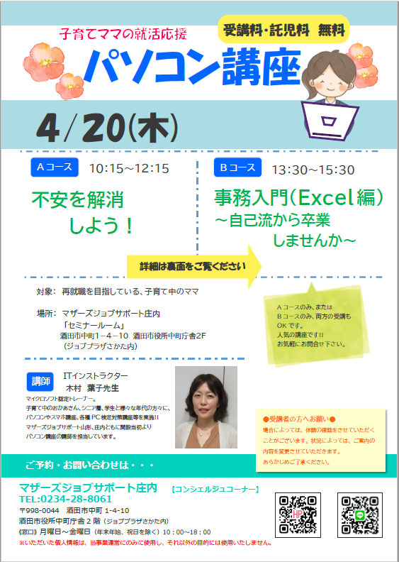 ☆マザーズジョブサポート庄内主催☆ 就活応援『パソコン講座』のお知らせ 満員御礼! A・Bコース※お申し込みいただいた方、 ありがとうございました。 当日お待ちしております。※キャンセル待ちでの受付は 行っております。 ≪Aコース≫  4月20日(木)10:15〜12:15『不安を解消しよう!』「求人票の"パソコンが使える方"ってどの程度?」「仕事では、どのくらいのスキルが求められるの?」「WordとExcelって、どの程度使えると大丈夫?」などいろいろな不安がありますよね…   パソコンについての"これから"を考えるきっかけに♪  ≪Bコース≫4月20日(木)13:30〜15:30『事務入門(Excel編) 〜自己流から卒業しませんか』事務のお仕事にも、一般・経理・労務など様々です。それぞれどのようなパソコン作業があるのかを確認していきます。実際にエクセルで、関数を利用し請求書を作成します。 ♪片方のコースのみ、両方のコース、どちらの受講でも可能です♪【対 象】就職を目指している子育て中のママ※就職活動前で何かを始めたいママもOK【会 場】マザーズジョブサポート庄内 セミナールーム【料 金】受講料 及び 託児料 無料【託 児】 ※事前登録・予約が必要です。保育ルーム開室日【水・木・金】の 10:00〜16:00に登録にお越し下さい。 ※併設の保育ルームで、保育スタッフが お子さんをお預かりします。 ママは安心して受講いただけます。 【駐車場について】お車でお越しの際は、中町庁舎脇にあるセントラルホテル契約駐車場をご利用ください。(ジョブプラザさかたと表示してあります。)※契約駐車場が満車の場合は、酒田市中央地下駐車場をご利用ください。無料駐車券(最大2時間)を発行いたします。お帰りの際に、コンシェルジュ窓口へお声がけください。 ★★受講者の皆様へお願い★★場合によっては、体調の確認をさせていただくことがございます。状況によっては、ご案内の変更をさせていただきます。あらかじめご了承ください。★★ーーーーーーーーーーーー★★どうぞ、お気軽にお問い合わせくださいね。 ◇お申込み・お問い合わせ◇マザーズジョブサポート庄内TEL:0234-28-8061メールでのお申込みはコチラ