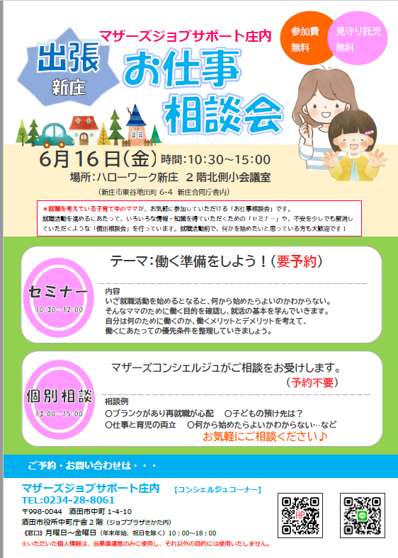 マザーズジョブサポート庄内おしごと相談会in新庄を開催します。 【開催日】6月16日(金)【開催場所】ハローワーク新庄 2階北側小会議室【内容】◎10:30〜12:00 セミナー  「働く準備をしよう!」 ※お申込みが必要です。 自分は何のために働くのか、働くメリット・ デメリットを考え、働くにあたっての優先条件を 整理しながら働く準備をしてみませんか?             ◎13:00〜15:00 個別相談会 ※どなたでもご利用いただけます      お申込みは不要です。 ・おしごとに関するお悩み ・子育てに関すること ・仕事と家事、子育てとの両立       など、お気軽にご相談ください。  ♪お子さんと一緒に、お気軽にお越しください♪お子さんと同じお部屋でセミナーを受講し、相談することができます。保育スタッフが、ママをサポートします。 どうぞ、お気軽にお問い合わせくださいね。 ◇お申込み・お問い合わせ◇マザーズジョブサポート庄内TEL:0234-28-8061メールでのお申込みはコチラ