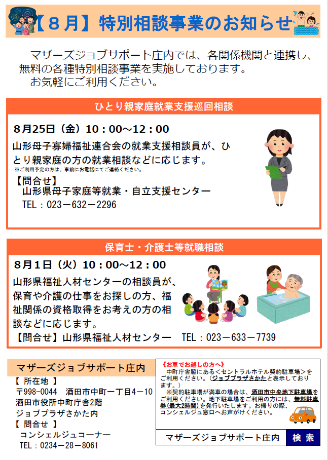 マザーズジョブサポート庄内では、各関係機関と連携し、各種特別相談事業を実施しております。ぜひ、ご利用ください。  保育士・介護士等就職相談 ※お申し込み不要日 時  8月1日(火)10:00〜12:00場 所  マザーズジョブサポート庄内 セミナールーム問合せ  山形県福祉人材センター      пF023-633-7739HP:http://www.ymgt-shakyo.or.jp/jinzai/保育士・介護士・看護師など資格をお持ちの方や、資格取得を目指している方、福祉職にご関心のある方は、お気軽にお越しください。  ひとり親家庭就業支援相談 [要予約]日 時 8月25日(金)10:00〜12:00場 所 マザーズジョブサポート庄内 セミナールーム問合せ 山形県母子家庭等就業・自立支援センター     пF023-632-2296HP:http://www.y-boshi.com/self-support/ひとり親家庭の方や今後について考えている方、どうぞお気軽にご相談ください。 ※各相談会について、利用ご希望の方は、マザーズジョブサポート庄内までお気軽にお声掛けください。※ご相談の際、お子さまの託児は『保育ルーム きらきら』をご利用いただけます。託児ルームのご利用には、事前のご登録が必要です。〇火曜日の託児ご利用については7月28日(金)午前までに お申し出ください。 【駐車場について】お車でお越しの際は、中町庁舎脇にあるセントラルホテル契約駐車場をご利用ください。(ジョブプラザさかたと表示してあります。)※契約駐車場が満車の場合は、酒田市中央地下駐車場をご利用ください。無料駐車券(最大2時間)を発行いたします。お帰りの際に、コンシェルジュ窓口へお声がけください。 ◇お申込み・お問い合わせ◇マザーズジョブサポート庄内TEL:0234-28-8061メールでのお申込みはコチラ