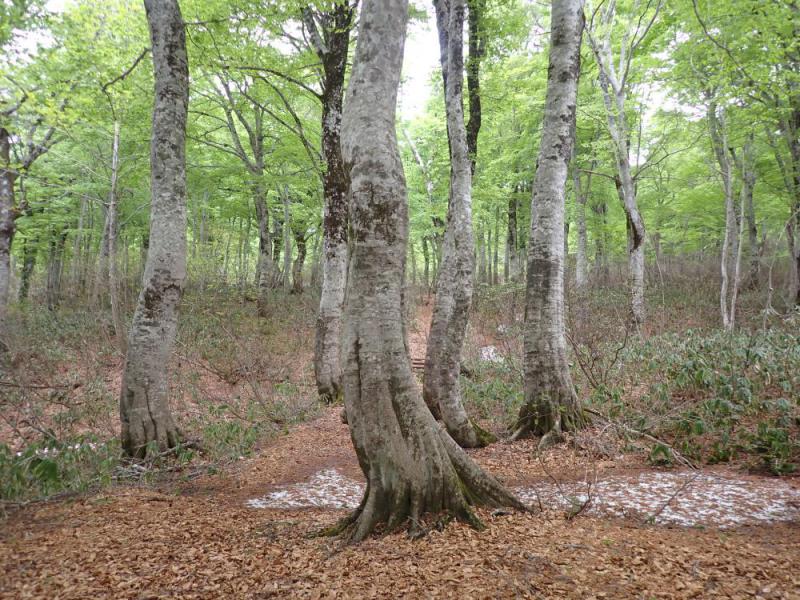 「「個性を大事にスケッチを通して自然を見つめる」を目当てにしての活動。今年で25年目になりました。 地球温暖化のご多分に漏れず、積雪減少、雪紅葉(芽鱗が雪上に散って秋のモミジが散った様になる)藻殆ど少なく、菜開きも見られなくなりました。 5月なのにブナ林も明るく既に新緑、ブナ肌も地衣類が生えて模様が出来、白い肌が見られなかった。15めいの会員で楽しいスケッチになりました。