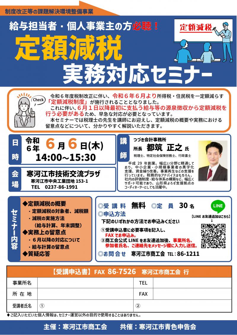 令和6年度税制改正に伴い、令和6年6月より所得税・住民税を一定額減らす「定額減税制度」が施行されることとなりました。これに伴い、6月1日以降最初に支払う給与等の源泉徴収から定額減税を行う必要があるため、早急な対応が必要となっております。本セミナーでは税理士の先生を講師にお迎えし、定額減税の概要や実務における留意点などについて、分かりやすく解説いただきます。 ■日時令和6年6月6日(木)14:00〜15:30 ■会場寒河江市技術交流プラザ ■講師つづき会計事務所 所長 都筑正之 氏(税理士・特定社会保険労務士、行政書士) ■受講料無料 ■定員30名 ■申込方法@チラシ下部の受講申込書に必要事項を記入しFAXにて申込A商工会公式LINEをお友達追加後、事業所名・参加者氏名・ご連絡先をメッセージ欄に入力し送信※商工会公式LINEのお友達追加はこちらから行えます。※詳細はチラシをご覧ください。