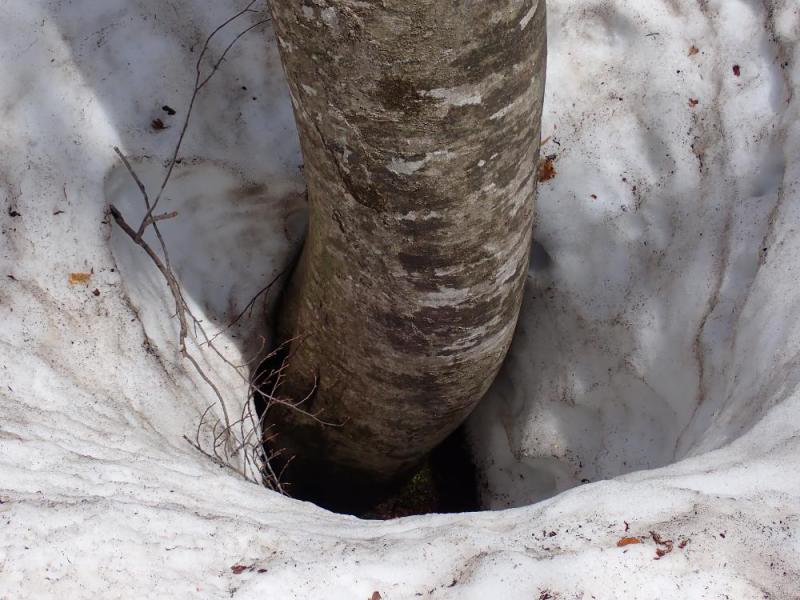夏になると「ここからブナの原生林です」ガイドさんの案内場所です。無数の「根開き」に囲まれます。穴の深さもまちまち、それによって原生林のさまざまな様子が想像出来ます。
