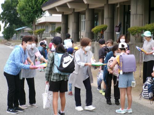 9月16日(火)、今年も更生保護女性の会の皆様が昇降口前で挨拶運動をしてくださいました。今年度は児童会スローガンに「あいさつでつなごう」という言葉を取りあげているように、校内でも運営委員会を中心に挨拶運動に力を入れています。その成果もあり、子供たちは更生保護女性の会の皆様に自分から挨拶することができていたようです。 このように、地域の方に学校に足を運んでもらい子供たちに声をかけていただくこと、顔を覚えていただくことで子供たちは地域の皆様に育てていただいている、愛されていると実感することができます。本当に有難いことです。 改めて、更生保護女性の会の皆様、朝早い時間から、ありがとうございました。 毎年、子供たち一人一人にファイルをいただいています。最初はパラパラ登校していた子供たちですが・・・8時前にはたくさんの子供たちが登校します。挨拶と笑顔があふれる素敵な時間となりました。