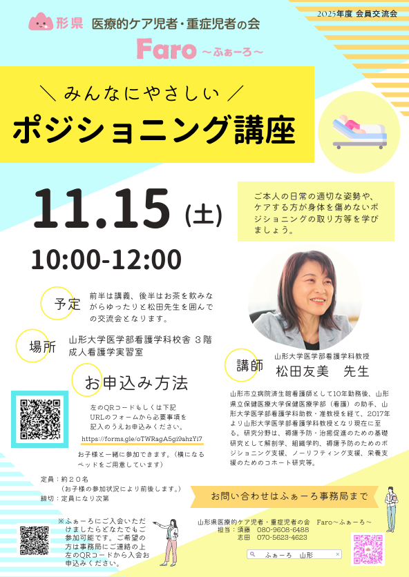 山形県医療的ケア児者・重症児者の会 Faro〜ふぁーろ〜より「2025年度会員交流会」のお知らせをいただいております!今年度は、11月15日(土)に山形大学医学部看護学科校舎を会場に「みんなにやさしいポジショニング講座」が行われます。普段の姿勢や介助者の腰痛を防ぐようなケアを学ぶ機会になりますね。お子さんとの参加がしやすいように、ベッドの準備もあるようです。チラシをご参照の上、参加ください!(医療ソーシャルワーカー)