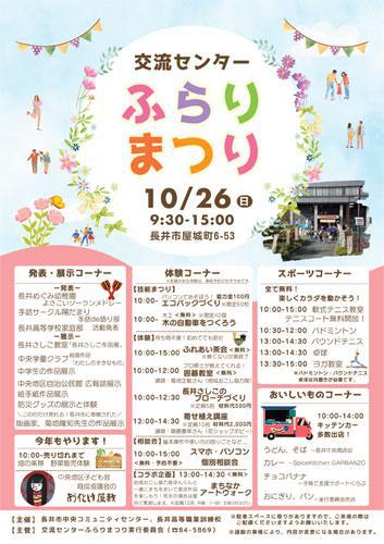 ※この事業は終了しました。ご来場、ご協力ありがとうございました。 今年も交流センターふらりまつりの季節がやってきました!長井市中央コミュニティセンターと長井高等職業訓練校の合同の文化祭です。(一財)文教の杜ながいと共催して行うまちなかアートウォーク、体を動かす体験(バドミントン、卓球、ヨガ、バウンドテニス、ソフトテニス)、ものづくり体験(長井さしこ、木工、アイロンプリント、寄せ植え)、長井めぐみ幼稚園や手話サークル「陽だまり」、長井高校家庭部の発表や地域のみなさんの作品展示、など楽しいことが盛りだくさん!お茶会やお化け屋敷、スタンプラリーに福引、おいしい食べ物の売店もありますよ。 盛りだくさんな内容がギュッと詰まった1日です。みなさまお誘いあわせのうえ、ぜひご来場ください。 ▽チラシはこちら表面 裏面(PDF) 主催:長井市中央コミュニティセンター、長井高等職業訓練校主管:交流センターふらりまつり実行委員会(長井市屋城町6-53 電話84-5869)※駐車スペースに限りがありますので、ご来場の際はご配慮くださいますようお願いいたします。※諸般の事情により、内容が変更になる場合があります。  Instagramはこちら