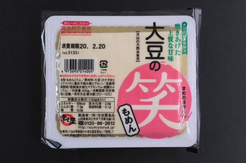 当社人気ナンバーワンの看板商品です。「一口食べれば、思わずニッコリと頬笑みがこぼれおちる」そんなお豆腐を提供したいという想いから「大豆の笑(まめのほほえみ)」と名づけました。なめらかな食感で大豆本来の旨みを味わえるまろやかなもめん豆腐です。1)まじめどうふ 手間暇をかけた昔ながらの製法で作りました。 一番のポイントは、《豆乳を凝固させる工程》にあります。 効率がよくて数多く作れる方法ではなく、 職人の手を使い、長年の技術が要するといわれている「高温凝固」を採用しています。 この昔ながらの高温凝固は低温凝固よりもコクと甘みがでます。 高温(約70℃前後)で豆乳とにがりをあわせ、一気に攪拌し固めますが、 凝固の反応速度が速いため、いわゆる豆腐職人の技です。2)ふわふわした食感 昔の豆腐にあったふわっとした口当たりを表現することにこだわりぬきました。 食べ比べて見ると、食感の違いが分かると思います。〈商品名〉 大豆の笑(まめのほほえみ)もめん〈名称〉 もめんとうふ〈原材料〉 大豆(カナダまたはアメリカ・遺伝子組み換えでない) 豆腐用凝固剤(粗製海水塩化マグネシウム・硫酸カルシウム)〈内容量〉 400g〈保存方法〉 要冷蔵(3℃〜10℃)→ 「大豆の笑(まめのほほえみ)もめん」ツインパック