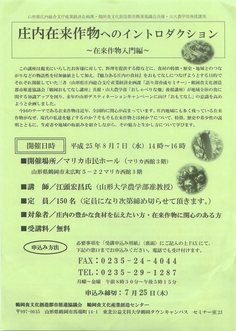 8月7日(水)14:00-16:00、鶴岡市マリカ市民ホールで、庄内の在来作物に関する入門講座を行います。受講は無料ですが、定員150名で予約が必要です。
