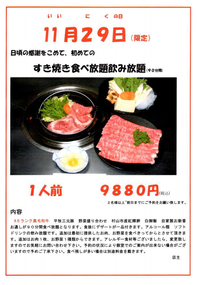11月29日(いい肉の日)限定企画日頃の感謝をこめてすき焼き食べ放題・飲み放題プランを企画しました。お一人様9,880円で山形牛ロース食べ放題です。もちろん飲み物も飲み放題です。皆様の、お越しお待ちしていますm(__)m前日まで、ご予約下さい。 (三代目企画)