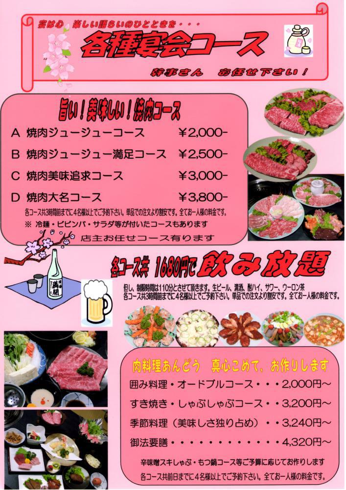 本日から、新年度ですね!何か浮き浮きしますね!春本番です!肉料理あんどう歓送迎会・入学祝い、花見の宴等の企画満載で皆様のお越しお待ちしています。ご利用くださいm(__)m焼肉だけ、すき焼きだけじやなく何品か付けてと言うお客様は、焼肉会席コース・すき焼き会席コース・しゃぶしゃぶ会席コースは如何でしょうか、ご予算に応じてお作りします。山形牛と季節の野菜を使った一人一人の料理も有ります!
