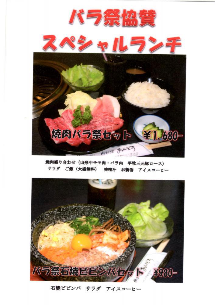 薔薇祭 協賛 スペシャルランチ東沢公園の薔薇の花、今週末見頃です!肉料理あんどうでは、協賛し、山形牛の美味しいお肉と、平田牧場三元豚ロースのコラボの焼肉ランチを用意して皆さんの、お越しお待ちしています、是非来て食べて下さい。