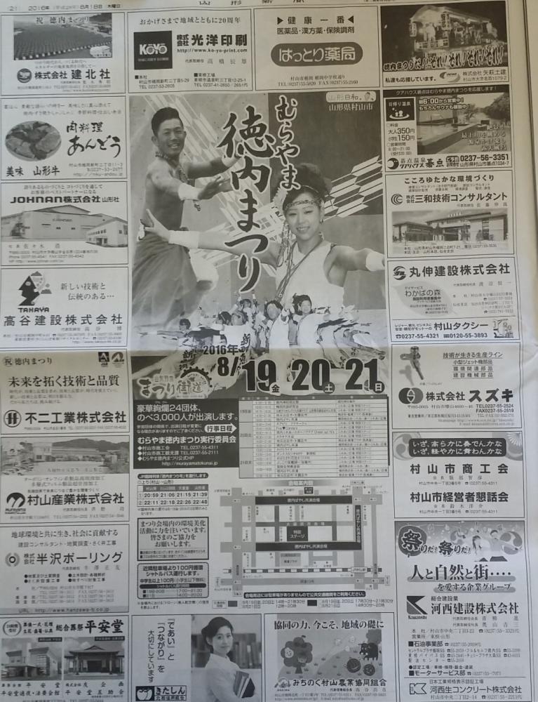 明日19日からむらやま徳内祭り始まります!今日の山形新聞に徳内祭りの宣伝載っていました!皆さん祭り見に来てください(^・^)V当、肉料理あんどうでも広告載せましたが祭り参加の為、期間中休業となります。ご了承ください。m(__)m本日は張り切って営業します!皆さん来てください、お待ちしています。