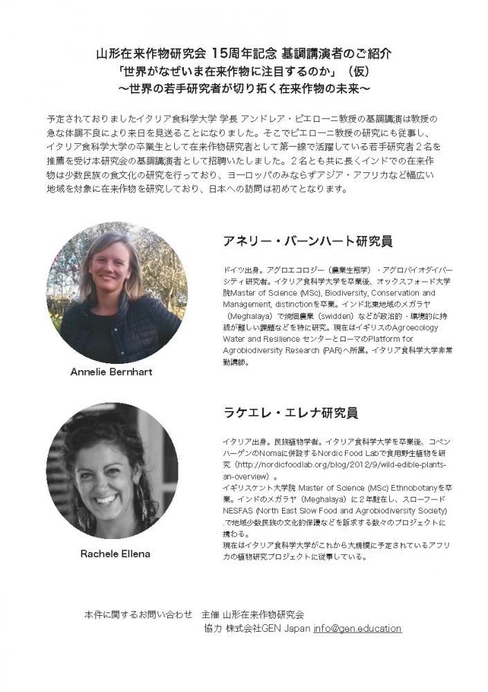 10月29日に予定している山形在来作物研究会公開フォーラムの第1部の内容を変更します。イタリア食科学大学学長のピエローニ先生に講演をいただく予定でしたが、先生が緊急に手術を要するご病気で入院され来日が難しくなりました。代わりにピエローニ先生が推薦してくださったすばらしい研究者(添付ファイルの方)が来日してくださることになりました。どうかご了承願います。