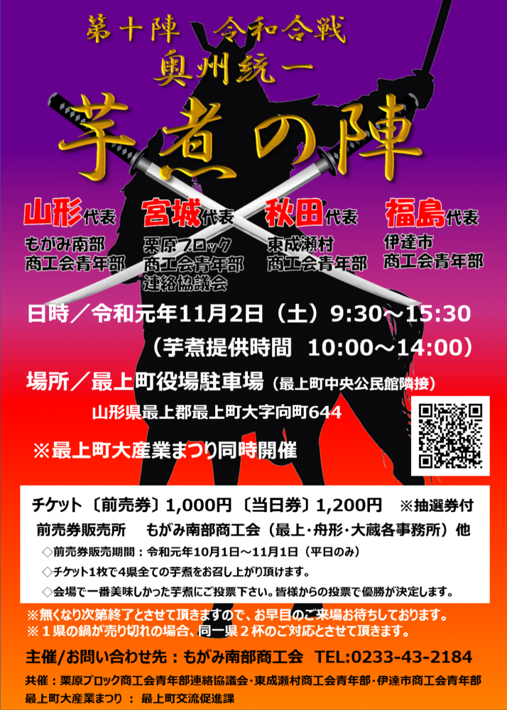 11月2日(土)に最上町役場で奥州統一芋煮の陣を開催します。 奥州統一芋煮の陣×最上町大産業まつり 節目の第10回記念「芋煮の陣」同時開催の「最上町大産業まつり」で秋の味覚を!東北各地の芋煮を食べられます。チケット1枚で4県すべての芋煮を味わえます!一番おいしいと思った芋煮に投票いただき、優勝を決める「芋煮の祭典」です。また、同時に大産業まつりも開催されます。最上町の農産物や加工品販売のほか、多数の出店を予定しております。是非、お越しください