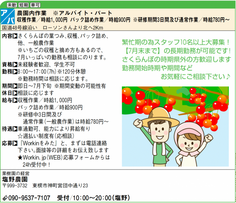 さくらんぼの葉つみ、収穫、パック詰めなどの農作業。・収穫作業/時給1,000円・パック詰め作業/時給 900円 ※研修中3日間及び通常作業(一般農作業)は時給780円〜☆車通勤可、能力により昇給有ります。☆週払い制度有ります。(応相談)☆いちご作業(収穫・摘み方)もあるため、 7月いっぱいの勤務も相談にのります。塩野農園TEL. 090-9537-7107受付:塩野(しおの)まで 10:00-20:00→ WEBからのお問合せはこちらからどうぞ。