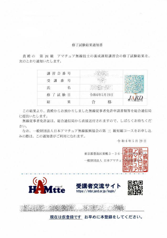 今日アマチュア無線4級の修了試験結果通知書が郵送で届きました。ネットではわかってたんですが、正式に届くと、ほっとします。講習会に参加しての合格だと、あとは免許証が届くのを待つのみなんですが、講習会なしの一発試験だと、合格通知だけが送られてきても、個人で免許証の申請をやらなくてはなりません。 私は免許証の到着を待つのみなので、断然こちらを進めます。但し、山形県だとアマチュア無線4級の講習会は、年1回(2週連続日曜日の2日間)しかないので、注意が必要です。無線従事者免許証の到着には、あとしばらくかかります。試験から1ヶ月くらいかかるそうなので、今月20日くらいかな?楽しみです。到着したら、ドローンを購入して開局申請をします。これから長い道のりです。
