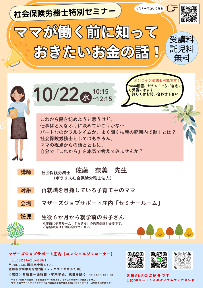 ☆ママが働く前に知っておきたい             お金の話!!☆「自分にはどんな働き方があっているのかな?」「よく聞く"扶養の範囲内で"働くって…?」プロとしてはもちろんママの視点からも語る社会保険労務士の話とともに自分の『これから』について考えてみませんか? 【日 時】10月22日(水)10時15分〜12時15分 【対 象】再就職・転職・復職を目指している子育て中のママ※就職活動前で何かを始めたい方でもOK【会 場】マザーズジョブサポート庄内 セミナールーム【料 金】受講料 及び 託児料 無料【託 児】※事前登録・予約が必要です。ご利用希望の方はお問合せください。保育ルーム開室日【水・木・金】の10:00〜16:00に登録が必要となります。 ※併設の保育ルームで、保育スタッフが お子さんをお預かりします。 ママは安心して受講いただけます。          【駐車場について】お車でお越しの際は、中町庁舎脇にある〈セントラルホテル契約駐車場〉をご利用ください。(ジョブプラザさかたと表示してあります。)※契約駐車場が満車の場合は、酒田市中央地下駐車場をご利用ください。無料駐車券(最大2時間)を発行いたします。 どうぞ、お気軽にお問い合わせくださいね。☆★☆コンシェルジュコーナーでLINEアカウントやっております♪              ☆★☆セミナーのお知らせや、お問い合わせ、お申込みにも対応しています♪ぜひお友達になってください☆https://lin.ee/zBnhdYULINEの場合は「お名前、電話番号、申込み講座、託児の有無」を送信して返信をお待ちください◇お申込み・お問い合わせ◇マザーズジョブサポート庄内TEL:0234-28-8061メールでのお申込みはコチラマザーズジョブサポート庄内コンシェルジュコーナーからの返信をもって申込受付完了となります