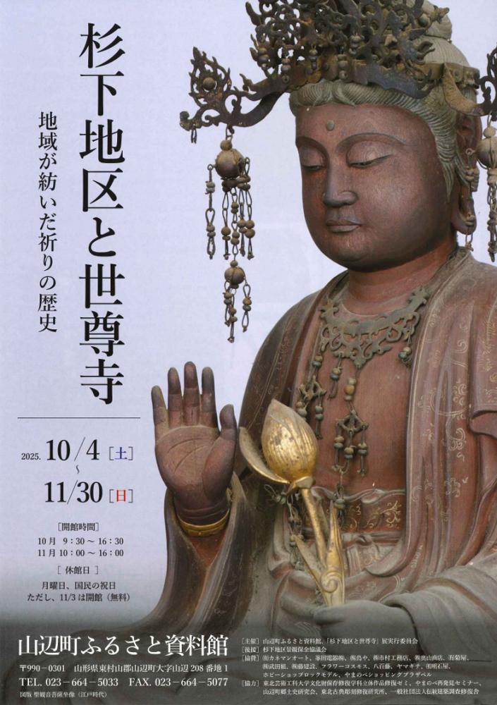 「杉下地区と世尊寺〜地域が紡いだ祈りの歴史〜」開催!山辺町ふるさと資料館にて、地域の歴史と文化を深く探る特別展が開催されます。仏像をはじめとする世尊寺の貴重な文化財約40点を展示し、歴史や特徴、地域の信仰の営みをご紹介します。公開講座やワークショップといった体験イベントも満載です。この秋は、山辺町の奥深い歴史に触れてみませんか?   イベント概要  開催期間: 2025年10月4日(土)〜11月30日(日) 開館期間: 10月: 9:30〜16:30 11月: 10:00〜16:00 休館日: 月曜日、国民の祝日(※ただし、11月3日(月・祝)は開館) 入館料: 大人: 200円 高校生以上: 100円 小人(小中学生): 50円 ※2025年11月3日(月・祝)は入館無料です。 会場: 山辺町ふるさと資料館     関連イベント:公開講座記念公演および展示物の解説特別展の開催を記念し、杉下地区の歴史や世尊寺に関する理解を深めるための講演会が開催されます。 日時: 10月4日(土) 13:30〜16:30 内容: @世尊寺の仏像と世尊寺について 講師: 渡邉真吾氏(東北古典彫刻修復研究所・副所長) A杉下村の歴史について 講師:須崎寛二氏(南陽市文化財保護審議会・会長、杉下地区出身) 会場: 山辺町中央公民館集会ホール 料金: 無料 (申込不要)     関連イベント:ワークショップ千年の大杉から大仏を作ろう!千年前の歴史に思いを馳せながら、オリジナルの仏像を作ってみませんか? 日時: 11月1日(土) 10:00〜16:00 (時間内はいつでも参加可。所要時間: 30〜50分程度) 講師: 東北古典彫刻修復研究所 会場: 山辺町ふるさと交流センター「あがらっしゃい」 料金: 無料 (申込不要、先着50名) 主催: 杉下地区景観保全協議会     山辺町ふるさと資料館 ご利用案内 住所: 〒990-0301 山形県東村山郡山辺町大字山辺208番地1 電話: 023-664-5033 FAX: 023-664-5377 公式サイト: 山辺町公式サイト ふるさと資料館ページ 駐車場: 有り(約10〜15台)     アクセス    JR羽前山辺駅: 徒歩約5分 山形中央IC: 車で約8分     よくあるご質問 (FAQ)  イベントの開催期間はいつですか?2025年10月4日(土)から11月30日(日)までです。  入場料はかかりますか?はい、入館料が必要です。大人200円、高校生以上100円、小人(小中学生)50円です。ただし、2025年11月3日(月・祝)は無料でご入館いただけます。  会場はどこですか?山辺町ふるさと資料館です。住所は山形県東村山郡山辺町大字山辺208番地1です。  公開講座やワークショップには参加できますか?はい、ご参加いただけます。公開講演会、ワークショップともに無料で、事前申込は不要です。ただし、ワークショップは先着50名様となります。  駐車場はありますか?はい、山辺町ふるさと資料館に約10〜15台分の駐車場がございます。