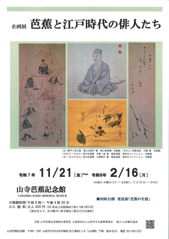 企画展「芭蕉と江戸時代の俳人たち」出品目録★ダウンロード →https://ssl.samidare.jp/~lavo/basho/box/20251125105446.pdf 「これまで以上に、さらに見ごたえのある充実した展示ですね。」と山本陽史氏(放送大学山形学習センター所長・山形大学名誉教授)も大絶賛!(^^)/是非、ご覧ください。 ☆見どころ☆〇山形市指定文化財3点を含む、松尾芭蕉の直筆10点(常設展示を含む)を公開します。〇芭蕉真筆「世にふるも」句文懐紙も展示します。松尾芭蕉が過去の歌人・文人の旅に思いを馳せたもので、芭蕉の人生観もにじみ出た作品です。〇芭蕉と門人森川許六の合作である「はるもやゝ」発句画賛も展示します。江戸時代の俳画の名品の一つです。