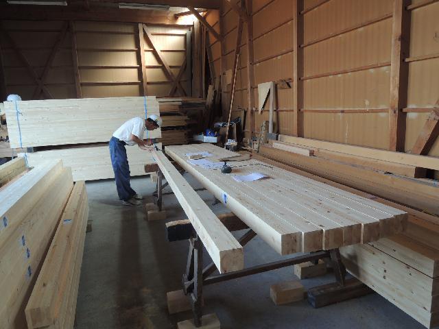 いつものように木材やさんの敷地を借りての事前加工です。テクノ材以外の「木材」を事前加工していきます。