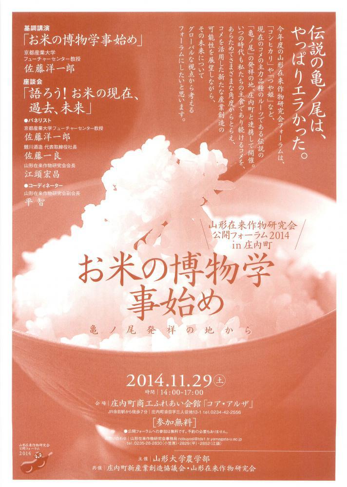 山形在来作物研究会公開フォーラム2014のチラシができました!11月29日(土)14:00から、庄内町コアアルザにて開催します。ことしは「お米の博物学」がテーマです。参加は無料で、予約も不要です。同日別会場(庄内たがわ農協新余目支所2階大ホール)にて「第8回あなたが選ぶ日本一おいしい米コンテストin庄内町 決勝大会」が同時開催されています。こちらも魅力的なイベントです。特にお昼は幻の米、亀ノ尾や森多早生なども含むいろいろな品種のおにぎりが振る舞われます。皆様、ぜひおこし下さい。