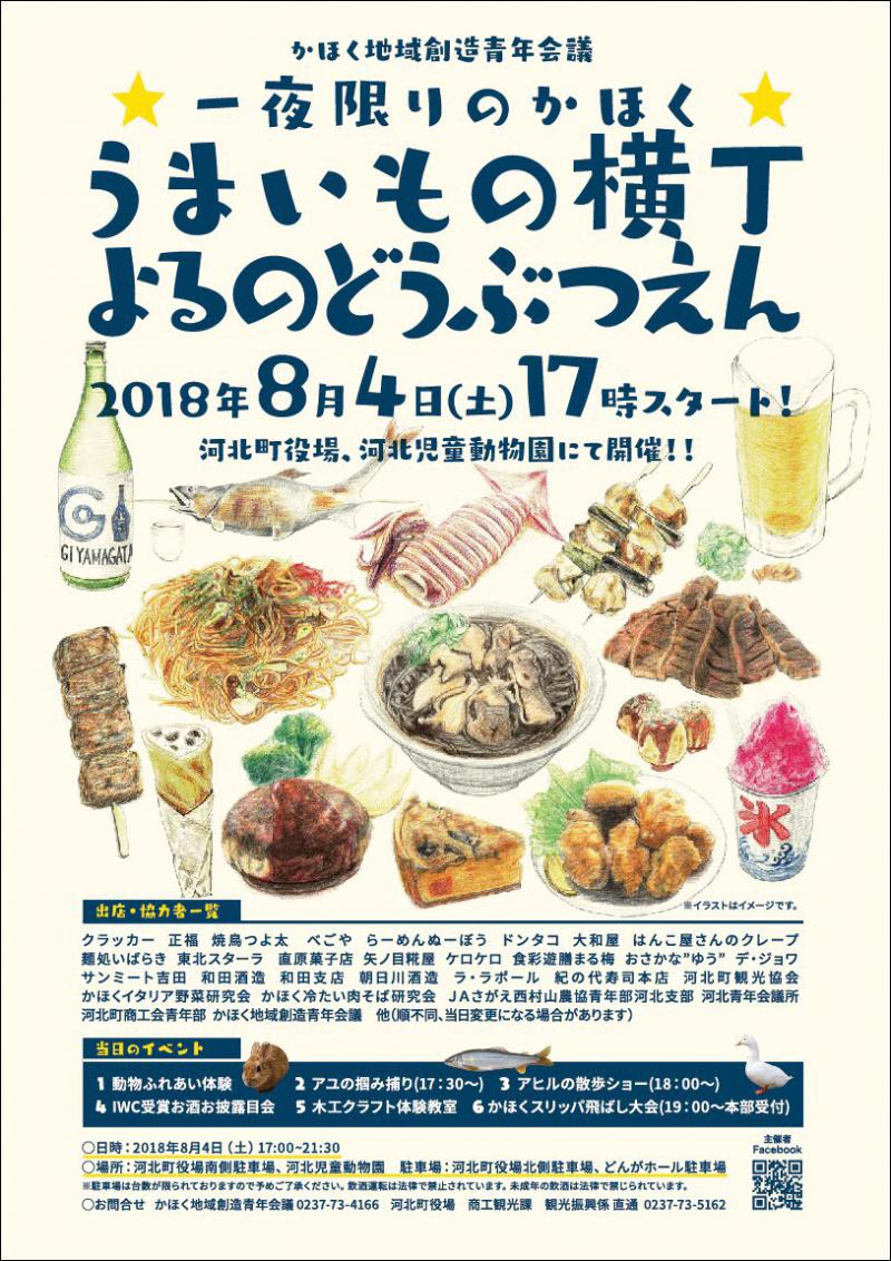 アユの掴み取り、アヒルの散歩ショーなど、うまい食べ物も盛りたくさん!河北町で夜も楽しい企画満載です!!第6回目の開催となった「一夜限りのかほくうまいもの横丁・よるのどうぶつえん」。例年、約10000人超の来場者を動員するご当地イベントです。地元有名なイタリア野菜を使った料理、冷たい肉そばをはじめ、町内28店舗の飲食店が集まり、それぞれの一押しグルメが一箇所で味わえる。隣接する河北町児童動物園では、アヒルの散歩ショーやヒツジ、ヤギ、ウサギとのふれあい体験が行われます。大人から子供まで満足できる!当日はウイング車を使い、特設ステージ上では、「スリッパ飛ばし大会」などが行われます。そして、今年はなんと!地元出身であり、世界初ヴィジュアル系演歌歌手として活躍中の 最上川司さん が河北町に凱旋することが急遽決定!19:00から30分程のステージショーが行われます。当日は8月1日(水)リリースのニューシングル「司の冷たい肉そば音頭」の即売会が行われ、購入者対象にサイン会が開催されます。真夏の夜で楽しいイベントです!!皆さん、ぜひ、来てけろ〜〜Information ■名称☆一夜限りのかほく☆ うまいもの横丁 よるのどうぶつえん ■開催日2018年8月4日(土) ■開催時間17:00〜21:00 ■開催地〒999-3511 山形県西村山郡河北町谷地戊81 河北町役場南側駐車場・河北町児童動物園 ■お問合せ先かほく地域創造青年会議 ■電話番号0237-73-4166 ■URLtown.kahoku.yamagata.jp ■アクセスJRさくらんぼ東根駅→タクシー(20分)/バス(25分) JR寒河江駅→タクシー(20分)/バス(25分) 山形空港→タクシー(10分) 寒河江I.C→国道112号線→国道347号線(20分) 東根I.C→国道287号線(7分) ■駐車場周辺のどんがホールなど、無料駐車場あり。