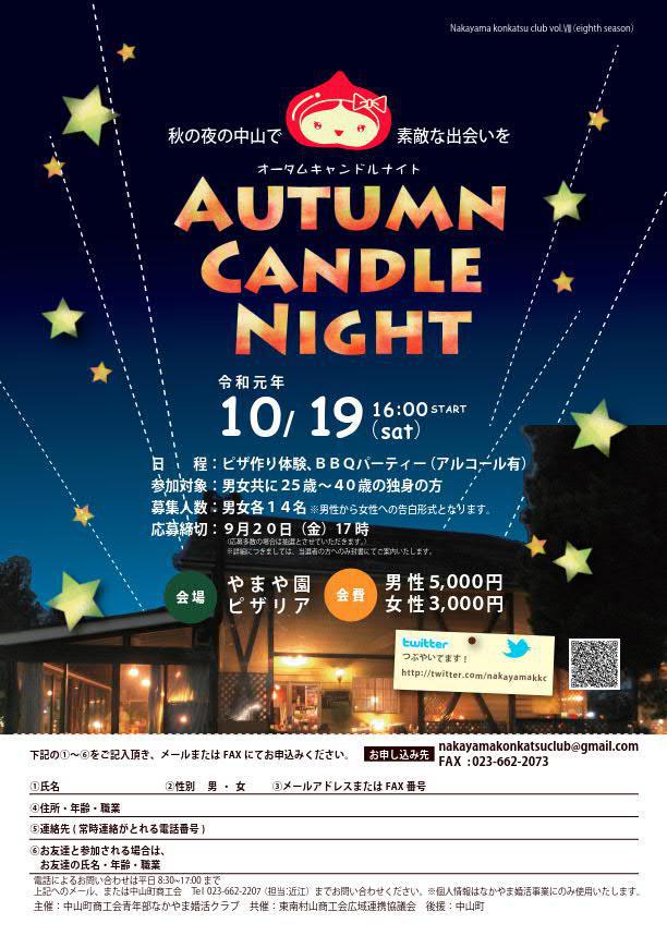 AUTUMN CANDLE  NIGHT(オータムキャンドルナイト)〜秋の夜の中山で素敵な出会いを〜中山町商工会青年部なかやま婚活クラブが開催し、毎回大好評の婚活イベントが今年も開催!!2019年10月19日(土)16:00スタート日  程:ピザ作り体験、BBQパーティー(アルコール有)参加対象:男女共に25歳〜40歳の独身の方募集人数:男女各14名  ※男性から女性への告白形式となります。応募締切:9月20日(金)17時      応募多数の場合は抽選とさせていただきます。      ※詳細につきましては、当選者の方へのみ封書でご案内します。会  場:やまや園 ピザリア料  金:男性 5,000円、女性 3,000円お問合先:中山町商工会 TEL 023-662-2207 FAX 023-662-2073
