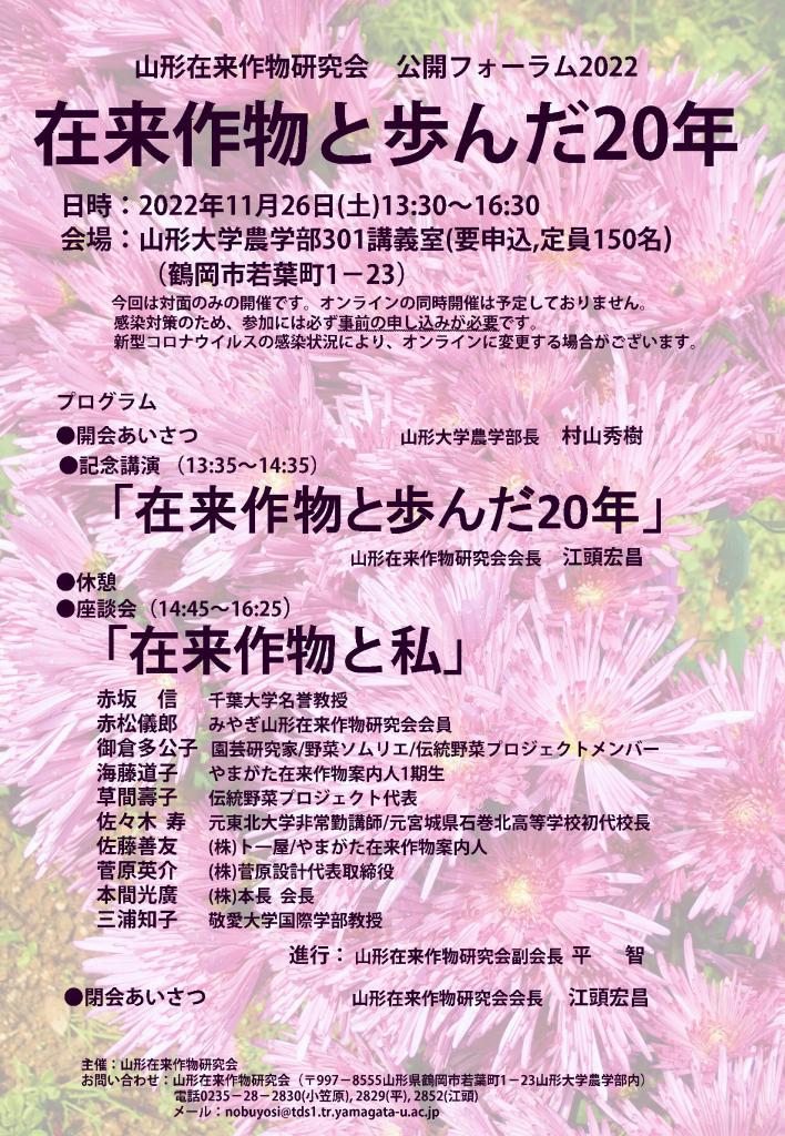 ※対面で開催の予定ですが、対面が中止の場合はご連絡します、連絡がない場合は対面開催です。以下の要領で公開フォーラムを開催します。参加は無料ですが、コロナ対策のため150人定員にしますので、予約が必要です。○テーマ: 「在来作物と歩んだ20年」○と き: 2022年11月26日(土)13:30〜16:30○ところ: 山形大学農学部301講義室(鶴岡市若葉町1−23) *今回は対面のみの開催です。オンラインの同時開催は予定しておりません。○日 程: ●在作研総会(13:00〜13:30)(302講義室)●公開フォーラム2022・開会あいさつ 山形大学農学部長 村山秀樹(13:30〜13:35)   ・記念講演(13:35〜14:35)(60分) 「在来作物と歩んだ20年」   山形在来作物研究会会長 江頭宏昌・休憩(14:35〜14:45)(10分)・座談会(14:45〜16:25)(90分)「在来作物と私」  赤坂 信 千葉大学名誉教授 赤松儀郎 みやぎ在来作物研究会会員 御倉多公子 園芸研究家・伝統野菜プロジェクトメンバー 海藤道子 やまがた在来作物案内人1期生 草間壽子 伝統野菜プロジェクト代表 佐々木寿 元東北大学非常勤講師・元宮城県石卷北高等学校初代校長 佐藤善友 (株)ト一屋・やまがた在来作物案内人 菅原英介 (株)菅原設計代表取締役 本間光廣 (株)本長 会長 三浦知子 敬愛大学国際学部教授      進行:山形在来作物研究会副会長 平  智・閉会あいさつ (16:25〜16:30)      山形在来作物研究会会長 江頭宏昌主催:山形在来作物研究会お問い合わせ:山形在来作物研究会 事務局 0235-28-28230(小笠原)、2829(平)、2852(江頭)メール(在作研事務局:小笠原):nobuyosi@tds1.tr.yamagata-u.ac.jp             @の前のsiはshiではなく、siなので注意申込は 下記の内容をFAX:0235-28-2812または上の在作研事務局(小笠原)のメールにておしらせ下さい。--------------------対面開催が中止になった場合は、オンラインで参加(する・しない)お名前(ふりがな)ご住所電話FAXまたはメールアドレスご職業----------------------------------なお関連行事として、 26日10:00〜は、鶴岡駅前のFOODEVERにて、「小さな小さな在来かぶサミット」という庄内と最上のカブを中心に展示・販売を行う催しがあります。 27日(日)14:30から、山形市の東ソーアリーナにてミュージカル「しあわせのタネ」の公演があります。2014年から各地で講演されてきたミュージカルですが、今年度でいよいよ終わりになるそうです。今年は山形市の蔵王かぼちゃがテーマ。今年も素晴らしい俳優さんたちが登場するそうで、感動的な舞台になりそうです。また澤田知可子さんも特別出演されるとか。