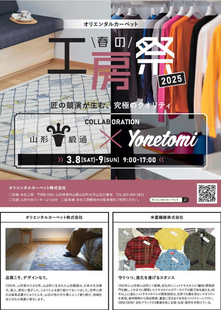 “山形緞通×Yonetomi”モノづくりの町を代表する企業がコラボレーション!伝統と革新が融合された究極のクオリティをご体感ください。【日時】3月8日(土)〜3月9日(日) 9:00〜17:00【場所】オリエンタルカーペット本社工房山形県東村山郡山辺町大字山辺21番地当日は体験コーナーもございます!