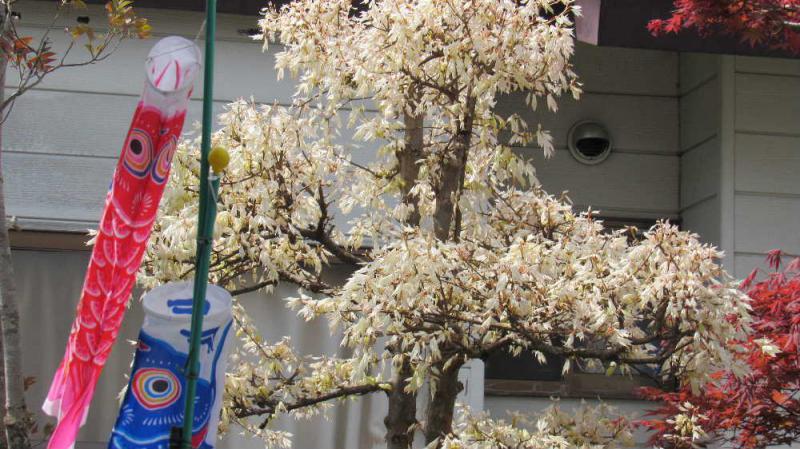 ●メイプルレインボーの葉が白くなりました 葉が7色に変わるといわれているメイプルレインボーの葉がピンクから白に変りました 満開の白い花が咲いたかのように陽の光をあびています 小さなおもちゃのこいのぼりが風に泳いでいます 昨日は「子どもの日」です 今日で連休が終わりいよいよ初夏の農作業の季節です 田んぼを起こす耕運機の音が響いてくるのもまもなくです