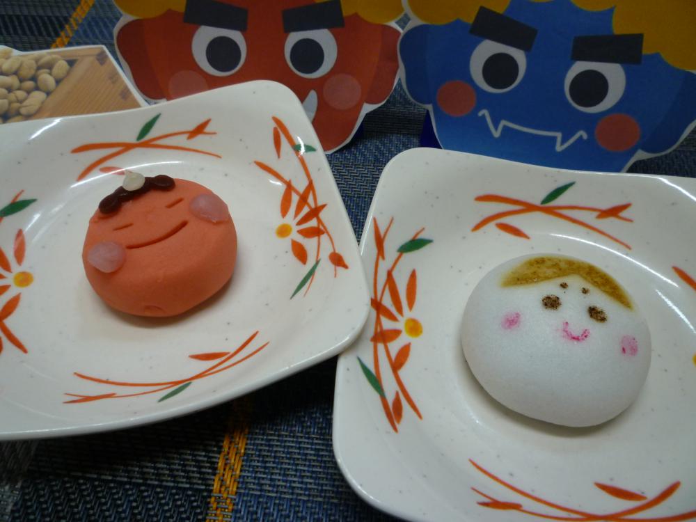 節分のおやつとして、赤鬼とお多福の和菓子を