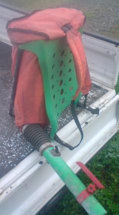 写真の道具に20kgぐらいの土壌改良剤を入れ、田んぼを歩き、散布します。