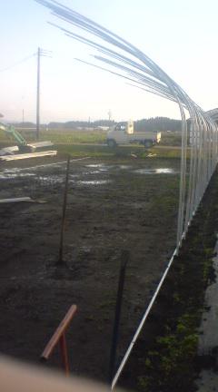 晴れ間を見ながら、ビニールハウスの骨組みを組み立てをしています。