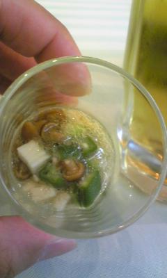 ナメコとオクラとヤマイモをダシで味付けした料理だったんですが、ネバネバがおいしかったです。
