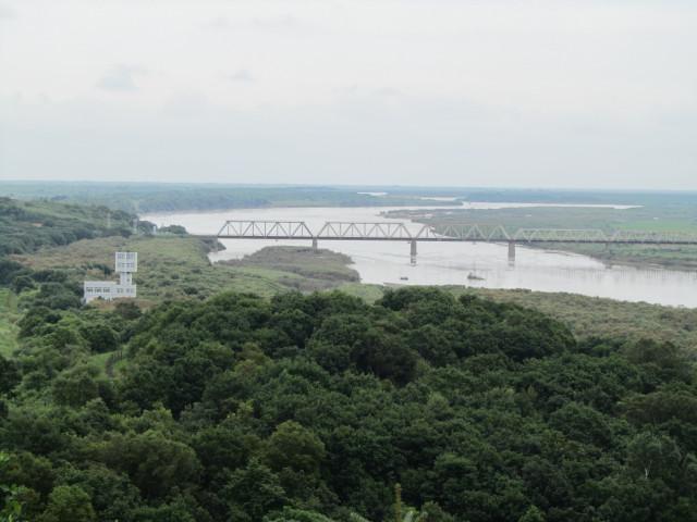 写真は、展望台から眺めた豆満江河口方向です。この展望台までが中国領で写真の豆満江左側はロシア領、右側は北朝鮮領です。中央に見える鉄橋は唯一、ロシアと北朝鮮を直接結ぶ橋だそうです。この展望台には(日本海まで12q)というプレートも取り付けてありました。