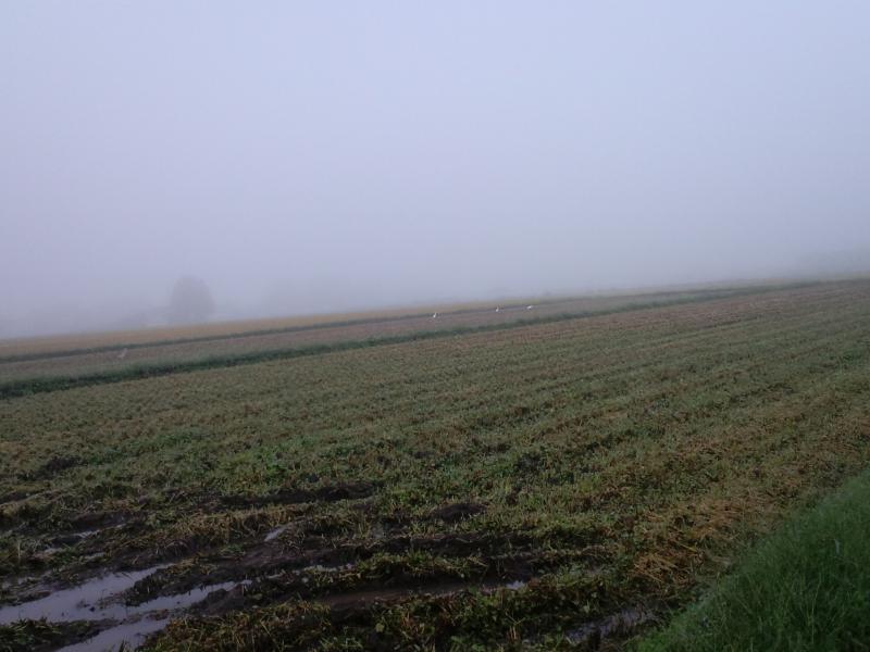 今朝、朝もやの中、田んぼで白鷺が餌をついばんでいました。