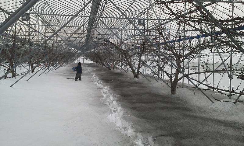 この消雪資材の散布は、消雪の為ばかりでなく、剪定作業中の強い日差しの照り返しを和らげることや、作業中の目の保護にも多少役立つと思っています。