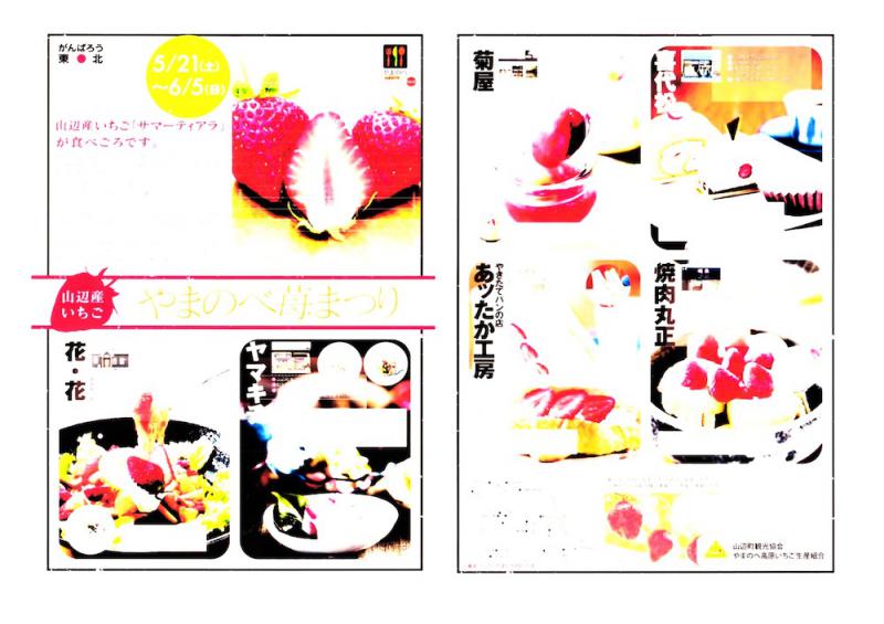 東日本大震災で被災された方々に心よりお見舞い申し上げます。5月21日(土)より開催中であります「やまのべ苺まつり」についてお知らせいたします。3月11日に発生した前代未聞の大災害から2ヶ月が過ぎ、復興に向けて皆様粉骨砕身頑張っているかと存じます。ですが、ここらで一休みしてはいかがでしょうか?山辺産いちご「サマーティアラ」は文字通り夏のパワー満載の夏いちごです。町内6店舗で皆さんの心と体を癒すべくお待ちしていますので、この機会に味わってみてください。まつり期間は6月5日(日)までです。お問い合わせ/山辺町観光協会 рO23−667−1106