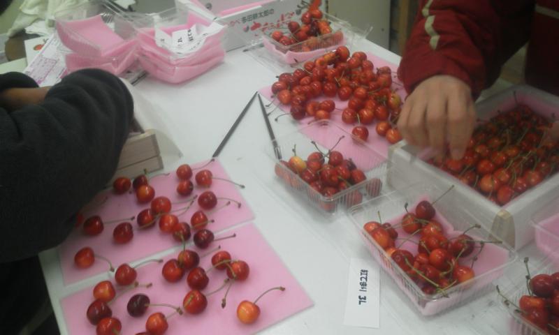 3度に保った冷蔵作業室で、選別しながら箱詰めをしています。