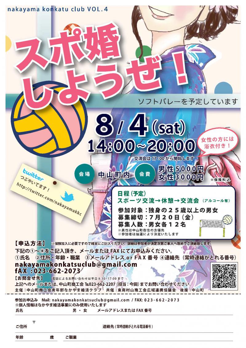 場 所は中山町内、参加対象は独身の25歳以上の男女です。募集期日は、7月20日まで男女各12名です。(参加者は抽選となります。)