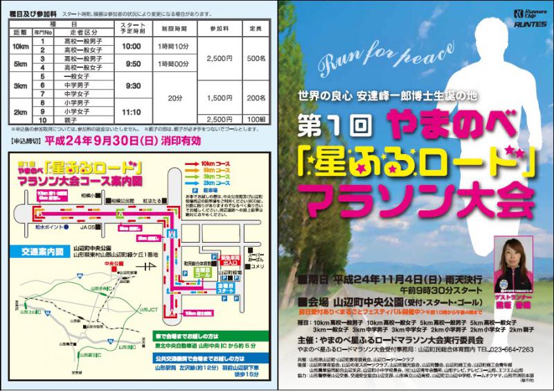 山辺町ではじめて開催されるマラソン大会に参加してみませんか?参加賞は何と!ニットの町山辺産のニットマフラー爽やかな風に乗って星ふるロードを楽しく走りましょう現在、エントリー受付中!■日時 11月4日(日) 午前9時30分スタート ※雨天決行■受付 午前7時30分から8時20分(体育館前広場)※前日受付けあり 午前10時から午後4時まで■会場 山辺町中央公園(スタート・ゴール)■参加資格 健康で自分が希望する種目を時間内に完走できる方。 高校生以下の方は、保護者の同意が必要です。■参加料 高校・一般 / 2,500円 小中学生 / 1,500円 親子の部 / 2,500円 ※大会が天候などの理由で中止になった場合でも参加料の返金は致しません。■競技規則 2012年日本陸上競技連盟競技規則ならびに本大会規定に準じます。■種目 ・10km(高校一般男子、高校一般女子) ・5km(高校一般男子、高校一般女子) ・3km(一般女子、中学男子、中学女子) ・2km(小学男子、小学女子、親子)■参加賞 山辺産ニットマフラー■参加申込 受付期間/9月30日まで ※所定の振込取扱票にて郵便局に振り込む ※runnetによるエントリー(コンビニ、クレジットカート等からの払込)■お問合せ先 やまのべ星ふるロードマラソン大会実行委員会事務局(山辺町体育館内)TEL023−664−7263 FAX023−664−7256