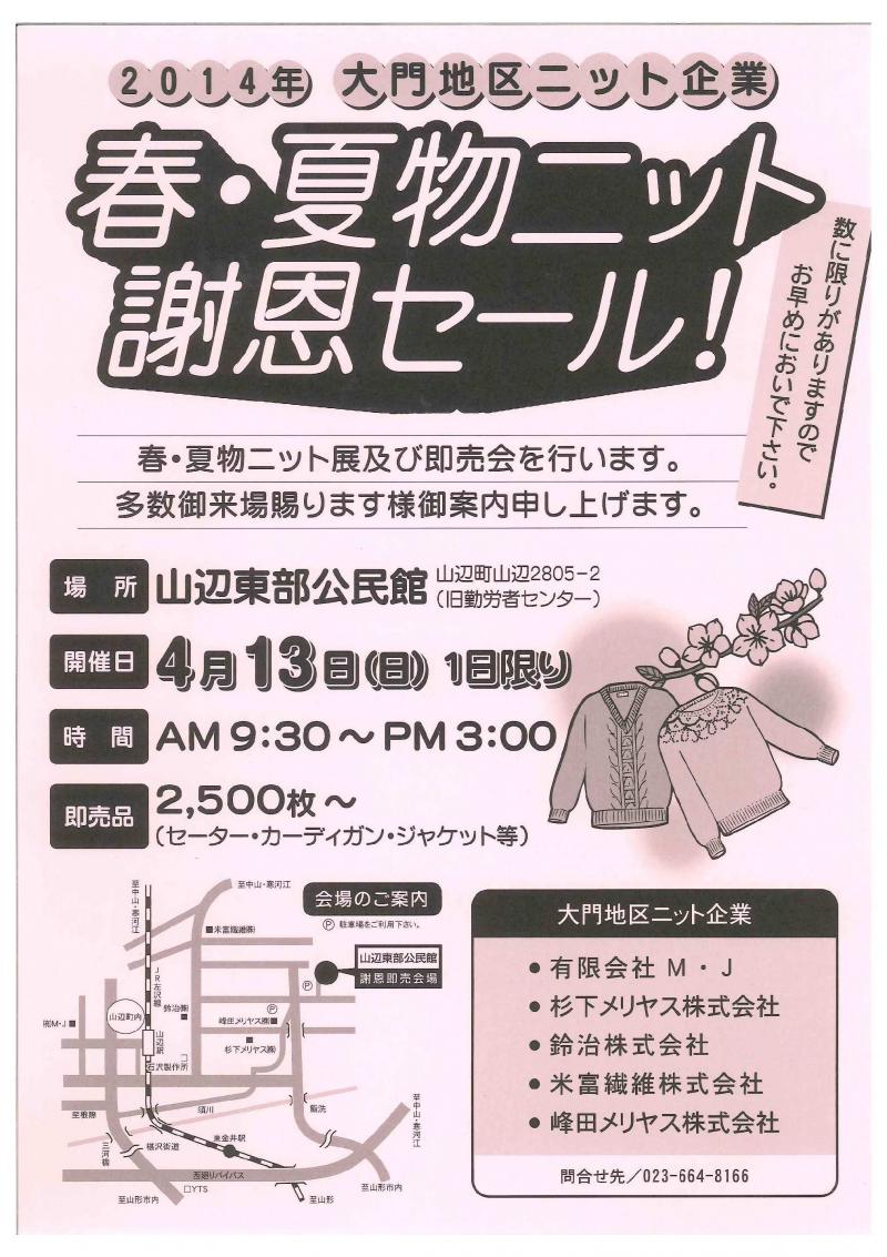 毎年恒例の大門地区ニット企業5社による春・夏物ニット謝恩セールが4月14日(日)に1日だけ開催されます。