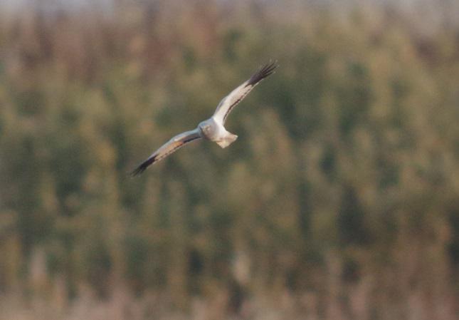 夕暮れ間際にハイイロチュウヒ♂が飛び出しました。薄暗い葦原にシャッター音が響きます。距離にして約300でしょうか。豆粒のような白い点です。