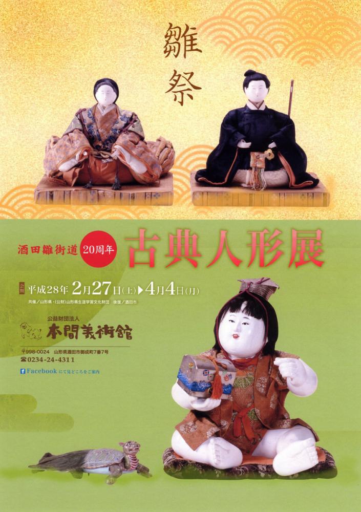 今年の「雛祭 古典人形展」のポスターができました!雛祭の広報関係は赤や桃色が非常に多いので、今回は黄色と黄緑を基調にしてみました。ちょっと渋めですが、品があって本間美術館らしいかな〜と思っています(^^ゞ昭和23年から続く歴史ある展覧会。北前船がもたらした雅な京人形の数々。楽しむだけでない、美術館で観る・感じる・学ぶ雛祭、古典人形展。そんな想いを感じて頂ければ幸いです。今年は酒田雛街道も20周年の節目を迎えます。展示の方にも力を入れますのでお楽しみ(´▽`) 只今、スタッフが庄内地域の皆様へポスター設置のお願いにお伺いしております。酒田雛街道を盛り上げるためにも、どうがご協力をお願いいたします。